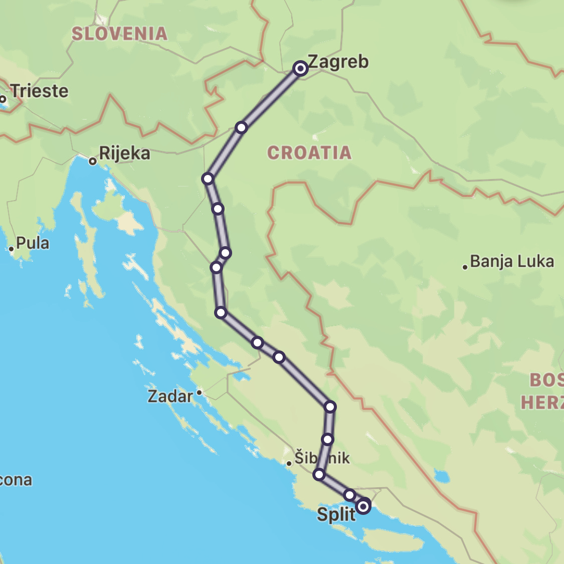The Split train station hides just off the road in front of the harbour - so easy to miss. The train to Zagreb took longer than the advertised six and a half hours thanks to slowing down to 20km/hr at intersections (which were frequent) and a fire on the tracks up ahead as we stopped in the tiny town of Unešić watching a small plane douse the flames. The staff on the train (hzpp) were very accommodating and apologetic.