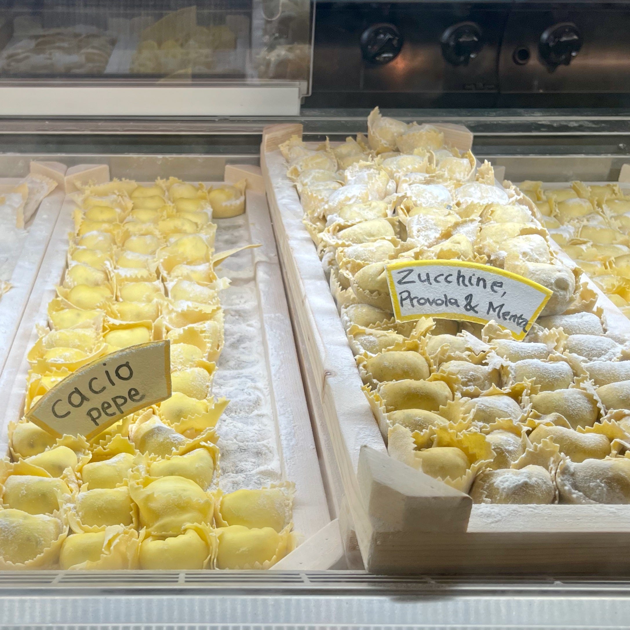 Queue #2 @labottegadellagina - fresh tortellini (and variants), seasonal fillings, multicoloured dough and made in front of you with some oil and placed in a simple paper bowl. The taste is anything but basic.