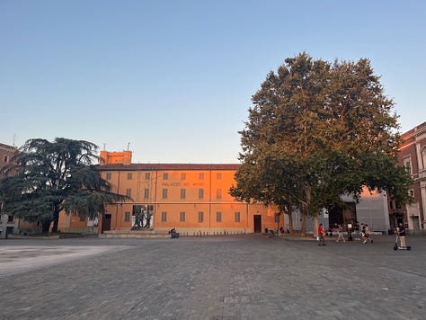 Sunday evening, peak July. Sun is still bright but not as strong. I amble through a few calm squares of Reggio Emilia. Calm and relaxed, and yet all around me are people sitting and talking in cafes. Whole families have their kids running or cycling or pushing some wheely thing around, or running through those water fountains. An adjacent green park has benches for seats for both the old and very young. Voices echo and travel, but not as a cacophony of noise. There are enough pockets of silence to make out distinct voices, even conversations.